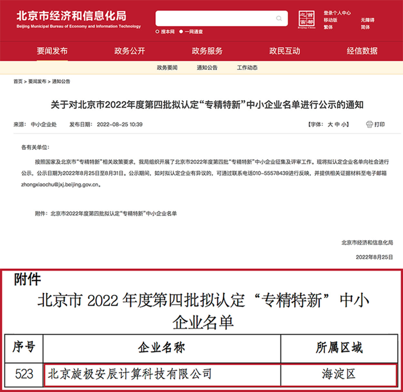 8月25日,北京市经济和信息化局公布北京市2022年度第四批“专精特新”中小企业名单,旋极安辰凭借在网络空间安全领域的可信计算技术创新研发能力和良好的市场影响力成功入选。