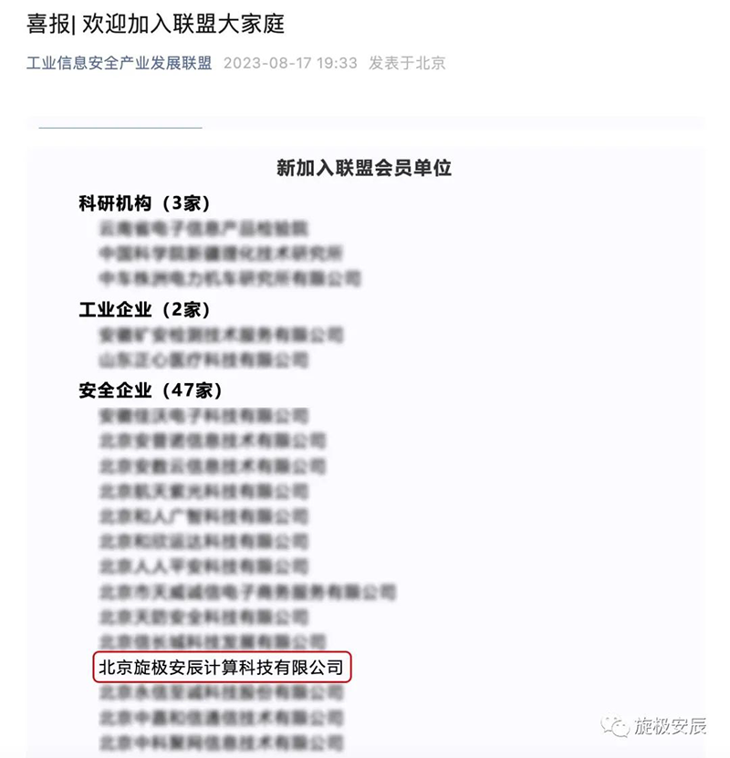 日前,工业信息安全产业发展联盟召开2023年度理事会第一次会议,会上公布了审议通过的新增会员单位名单,旋极安辰成功入选,成为新一批会员单位。