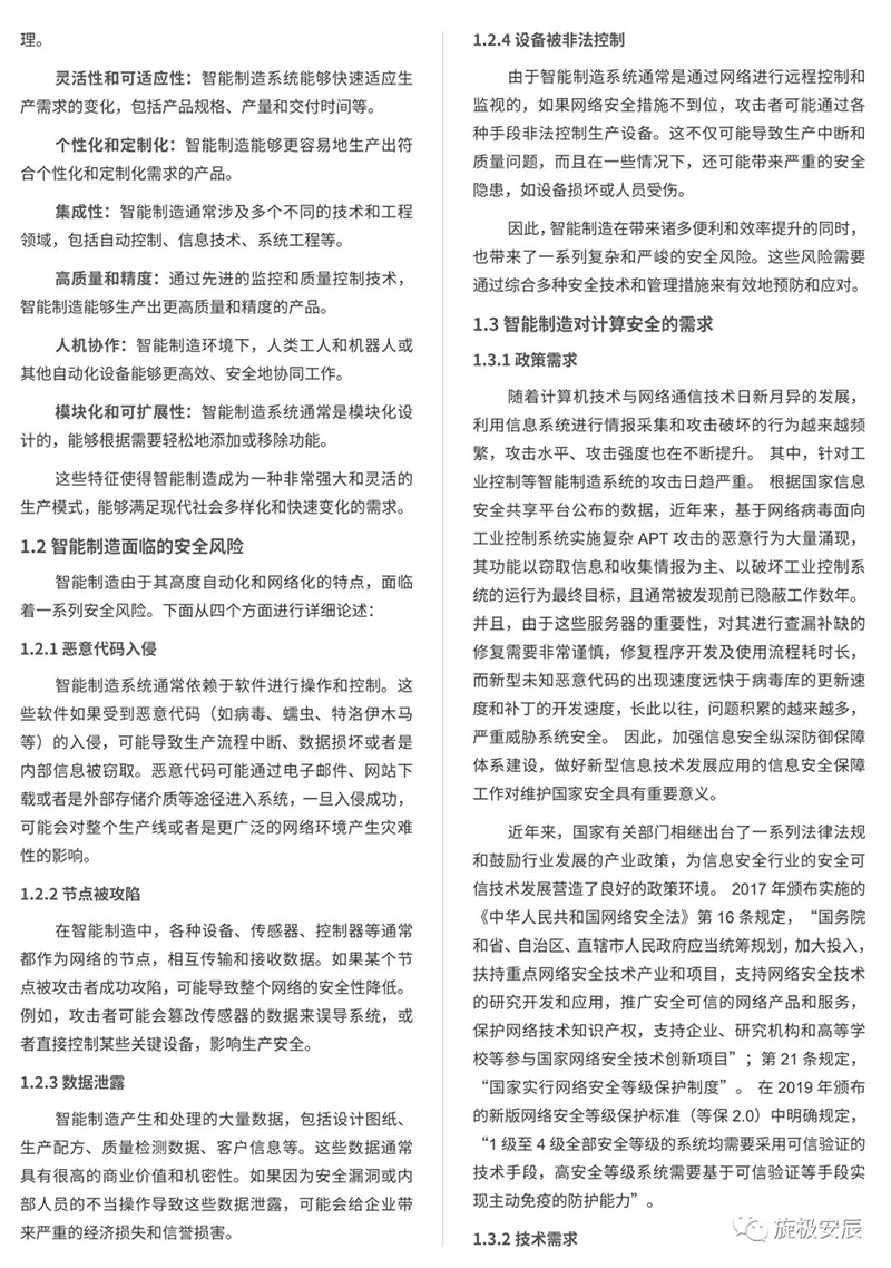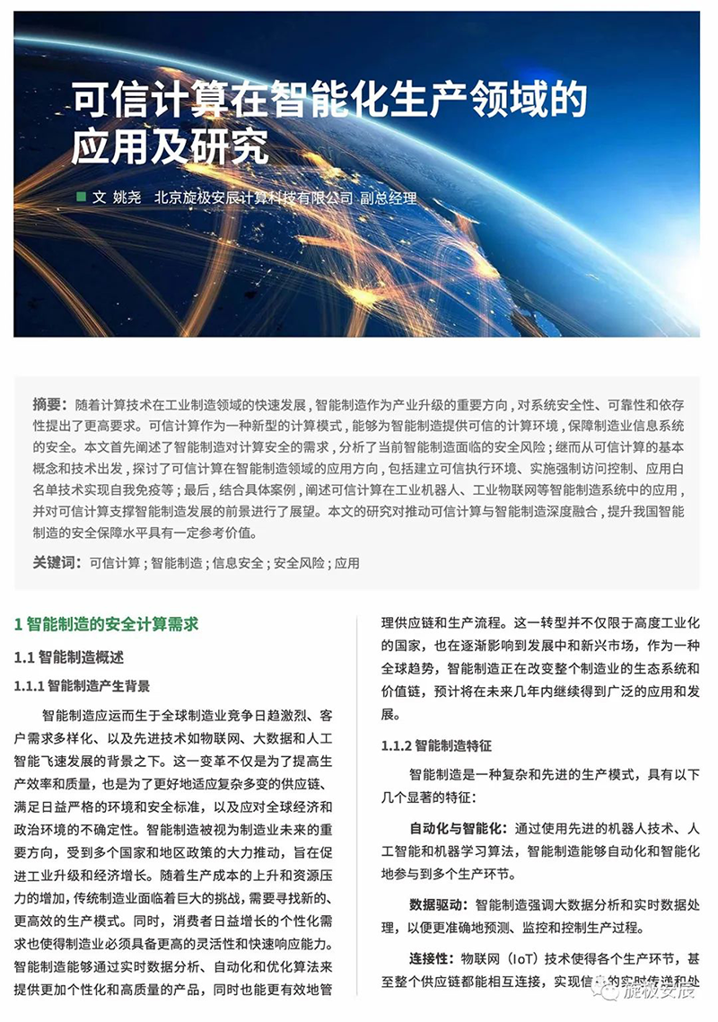 近日,旋极安辰公司副总经理姚尧在《旋极视界》期刊上发表了一篇名为《可信计算在智能化生产领域的应用及研究》的文章,阐述了智能制造对计算安全的需求,分析了当前智能制造面临的安全风险;继而从可信计算的基本概念和技术出发,探讨了可信计算在智能制造领域的应用方向,包括建立可信执行环境、实施强制访问控制、应用白名单技术实现自我免疫等;最后,结合具体案例,阐述可信计算在工业机器人、工业物联网等智能制造系统中的应用,并对可信计算支撑智能制造发展的前景进行了展望。本文的研究对推动可信计算与智能制造深度融合,提升我国智能制造的安全保障水平具有一定参考价值。因此旋极安辰公众号本期内容将分享该文章内容,供大家研究参考。
