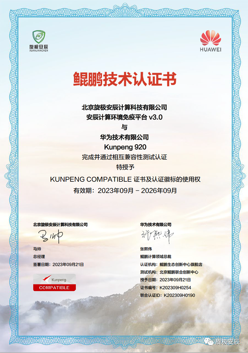 此次,旋极安辰的安辰计算环境免疫平台 v3.0通过华为鲲鹏兼容性认证,意味着该产品已实现兼容主流国产化硬件和操作系统,能够在国产化软硬件环境中安全稳定运行,为客户提供更加全面的服务保障。这不仅是旋极安辰国产化技术自主创新的成果之一,更是公司信创生态发展的重要里程碑。