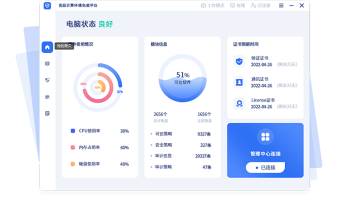 通过主动度量和控制,增强计算机机对恶意代码的主动防御的能力,对已知/未知病毒、木马、攻击程序等恶意代码的自免疫。
