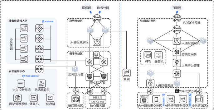 随着业务网应用的深入,各种移动办公、挂号等便捷式服务伴随着交叉进行数据交互的情况。医院网络开放网络具有很大的安全风险,医疗数据泄露事件频发。